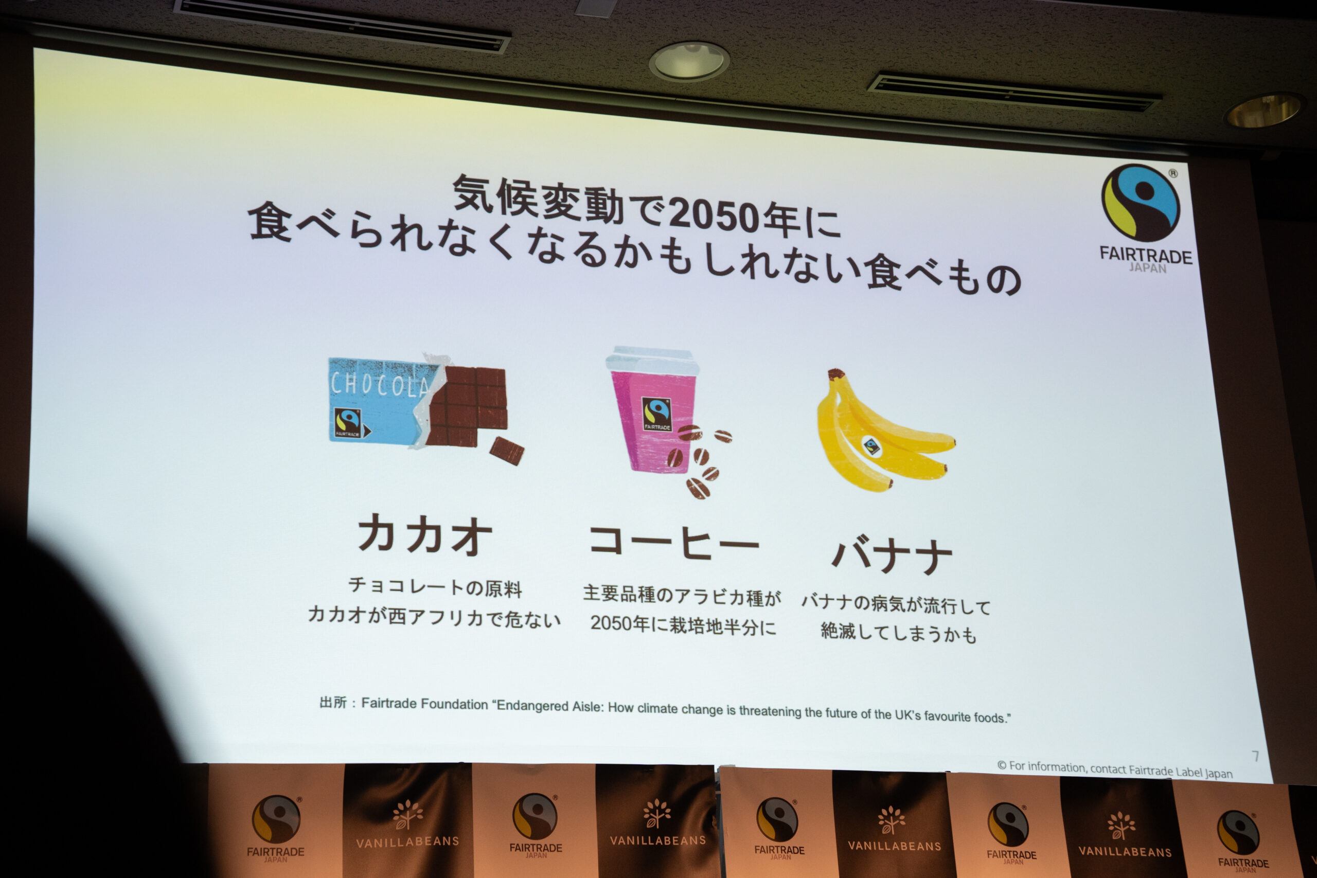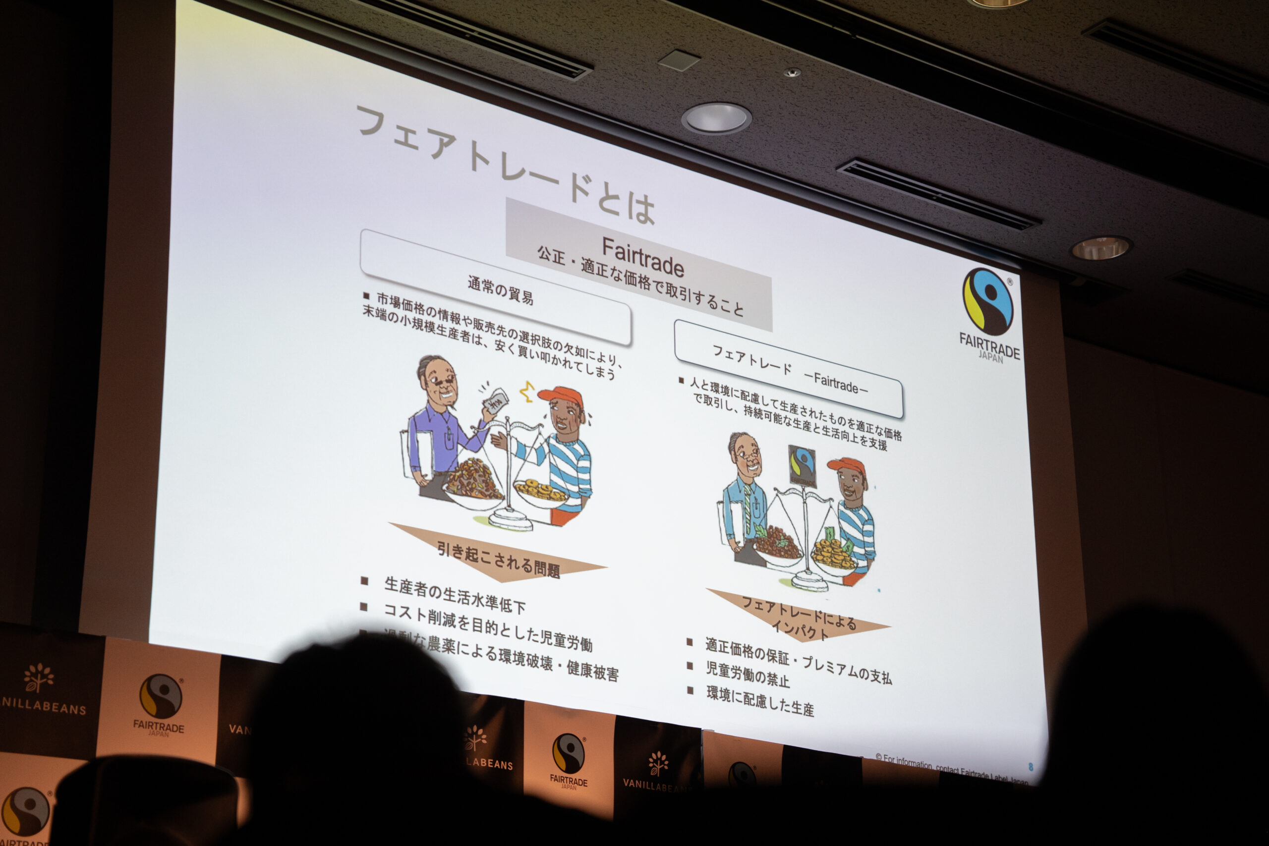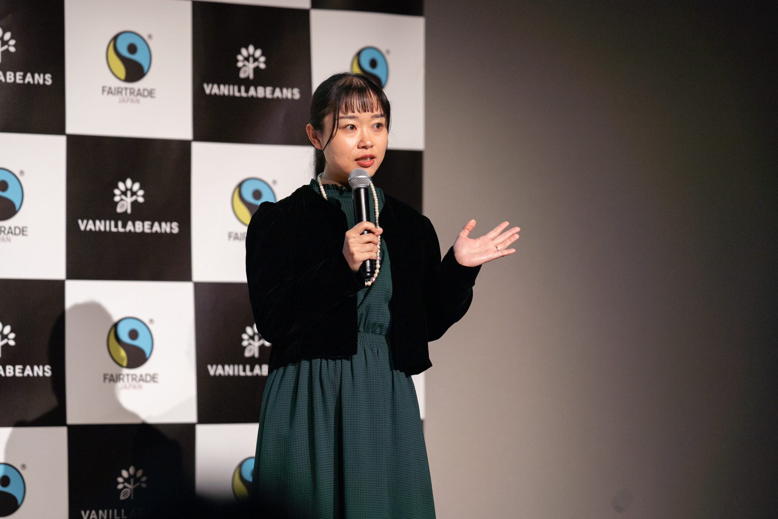 そして、特定非営利活動法人フェアトレード・ラベル・ジャパンの事業開発担当・真崎様にもご登壇いただき、フェアトレードの現状や、カカオを守るために行っている当社の取り組みについてお話ししました。
