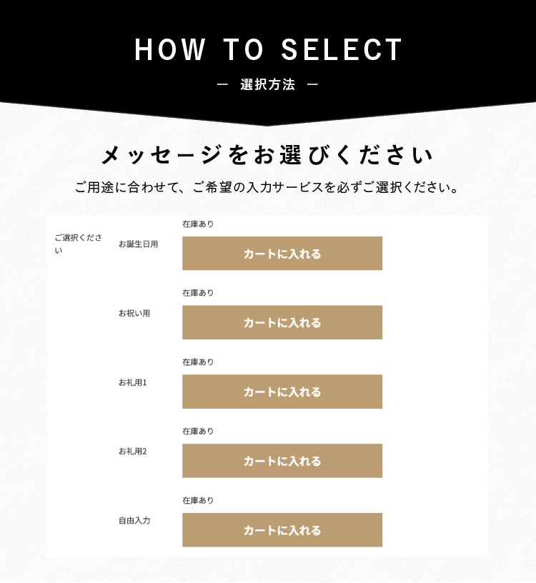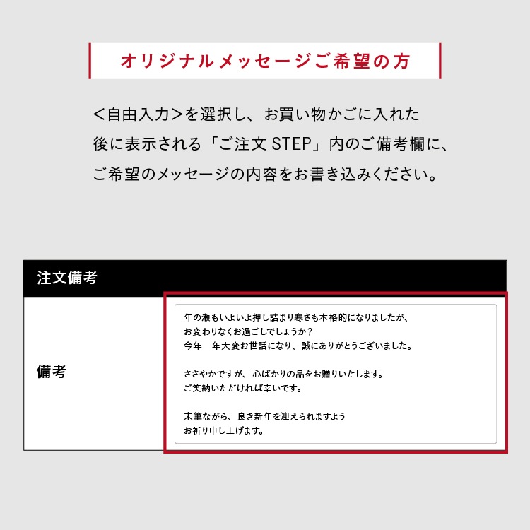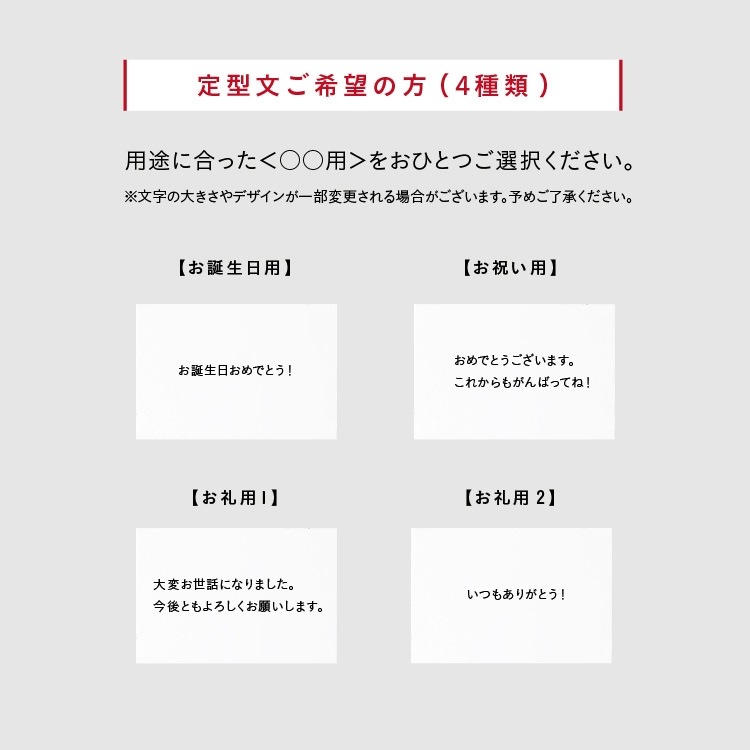 素敵な贈り物にするために、心をこめた一枚を添える... ▼定型文 ・お誕生日用:お誕生日おめでとう! ・お祝い用:おめでとうございます。これからもがんばってね! ・お礼用1:大変お世話になりました。今後とも宜しくお願いします。 ・お礼用2:いつもありがとう! ・自由入力:備考欄に入力いただいたメッセージを印字いたします ※白紙をご希望の場合は備考欄に何も記載せずご注文ください ▼定型文見本