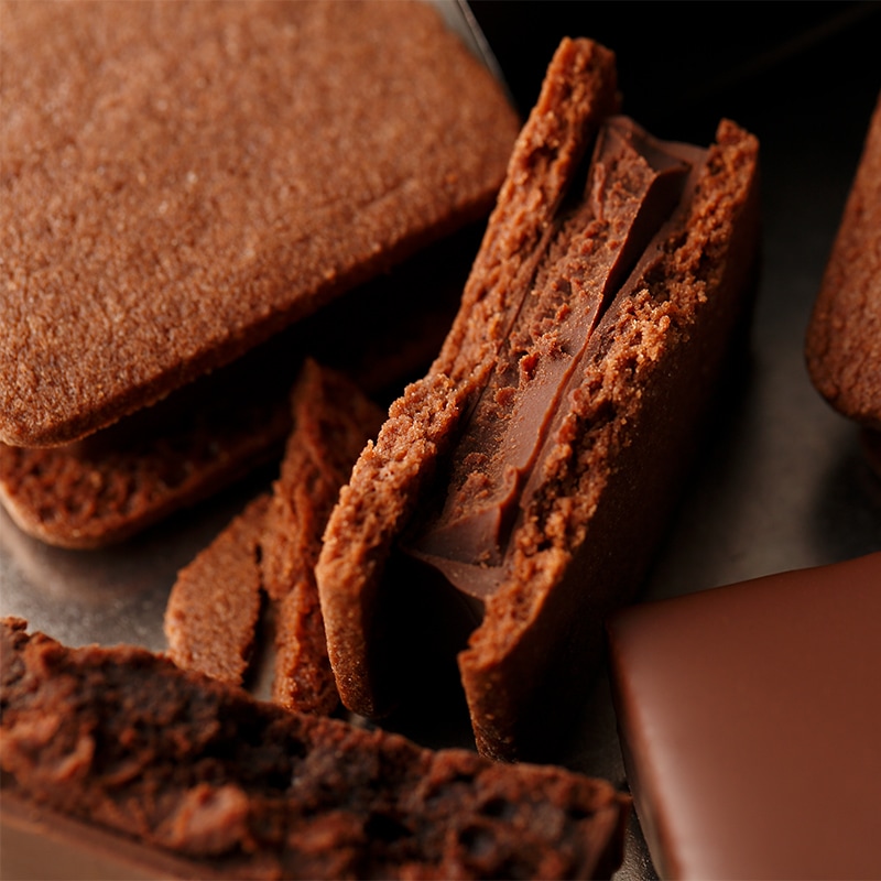濃厚なカカオ香るしっとりとしたクラシックショコラととろける口どけの生チョコレートの2層を、パリっと食感のチョコレートでコーティングしました。コーティングチョコのパリッとした食感が美味しさを物語り、口に入れた瞬間にとろりと溶ける甘さ控えめのガナッシュ。さらに、濃厚さの要となるしっとりとしたクラシックショコラ。この3層が奏でる「パリッ、とろっ、しっとり」のハーモニーを召し上がれ。
