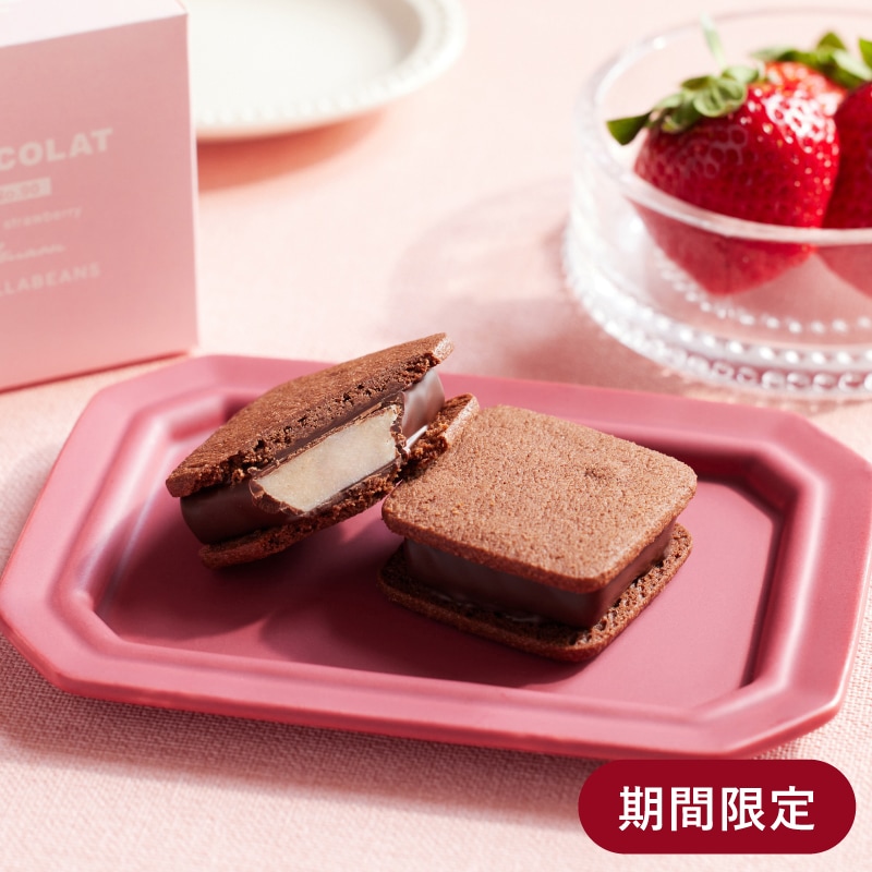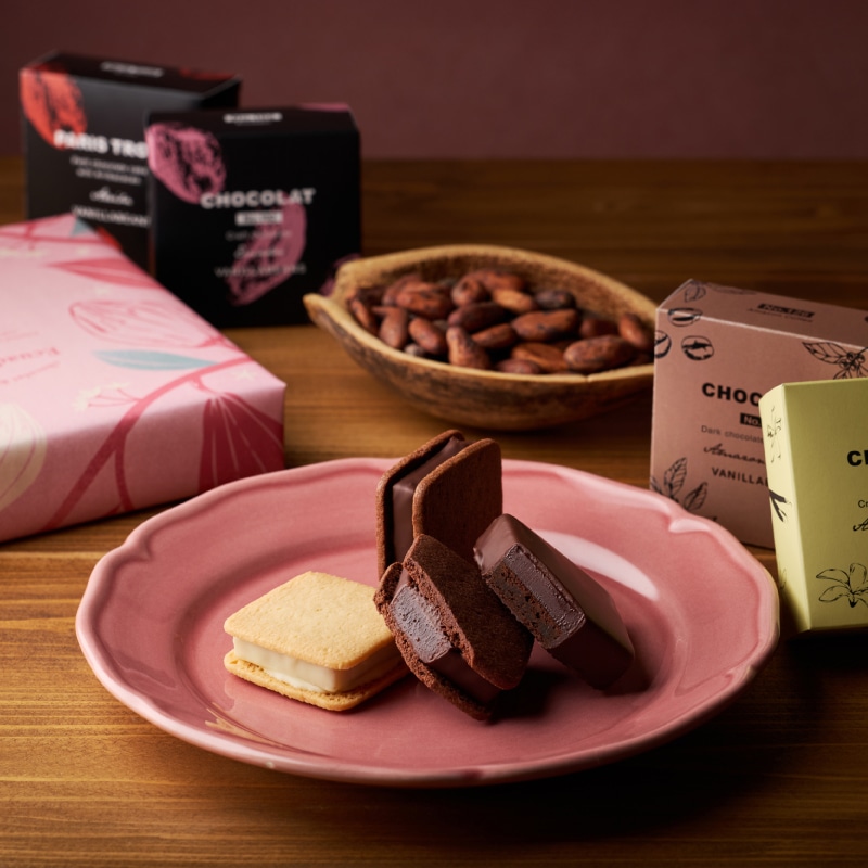 サクッ、パリッ、とろ~り。とろける生チョコレートをこだわりのクーベルチュールでコーティングし、サクサクのバタークッキーでサンドした、バニラビーンズオリジナルの生チョコクッキーサンド「ショーコラ」。一度口にしたら虜になる当店のロングセラー商品です。豊かなバターの風味とフェアトレードチョコレートを使用した"生チョコレート"の濃厚な甘さが口いっぱいに広がる味わいは、特別な日のお楽しみや、大切な人への贈り物としてもおすすめです。