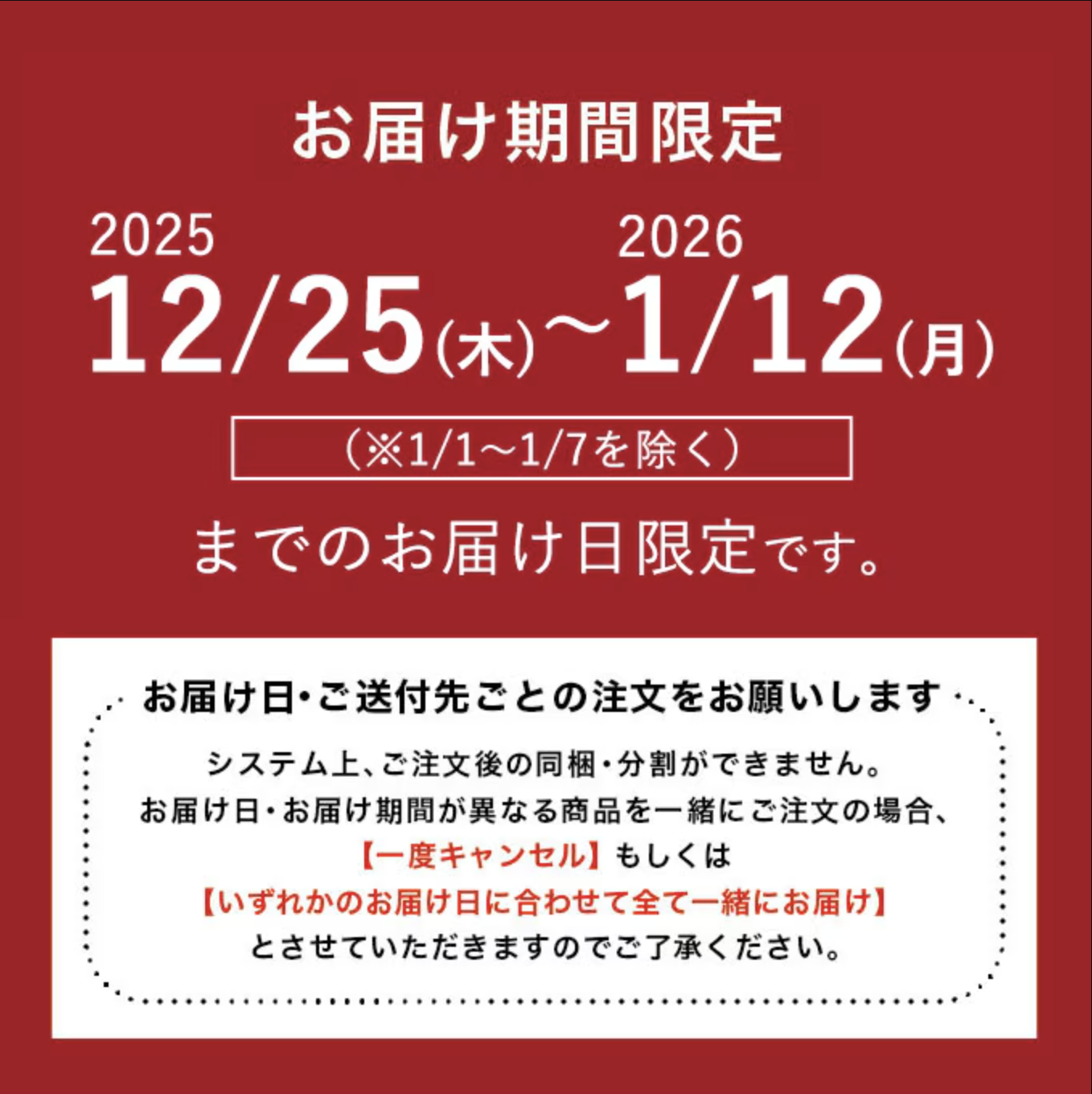 ※お届け日ごと、ご送付先ごとのご注文をお願いします