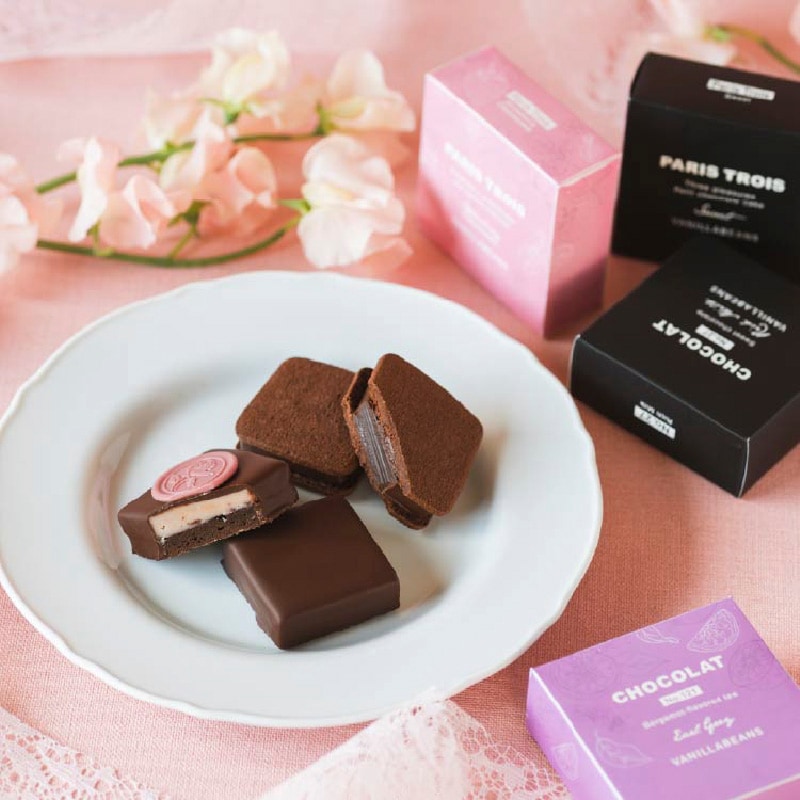 とろける生チョコレートをサクサクのバタークッキーでサンドした、当店のロングセラー商品「ショーコラ」。濃厚なクラシックショコラにとろりとした口どけのガナッシュの二層をクーベルチュールで薄く包み込んだ、贅沢なプチショコラケーキ「パリトロ」。季節限定のショーコラとパリトロのフレーバーを含んだ特別なアソートセットです。