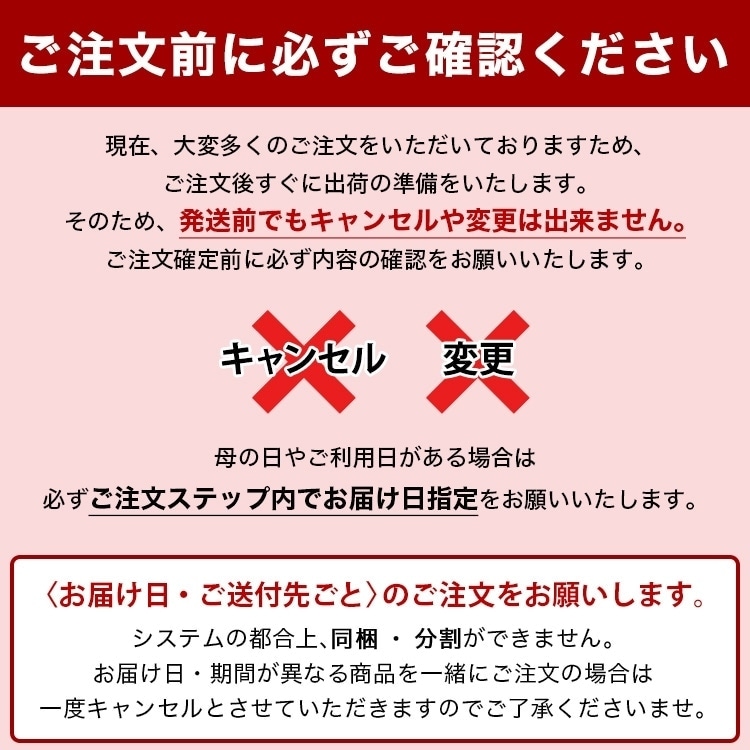 当店のシステム上、ご注文確定後にご注文を複数に分割したり、2つの注文を一つにすることができません。必ずお届け先、お届け日ごとのご注文をお願いします。誤ったご注文方法で購入された場合は、キャンセルとさせていただく場合がございます。