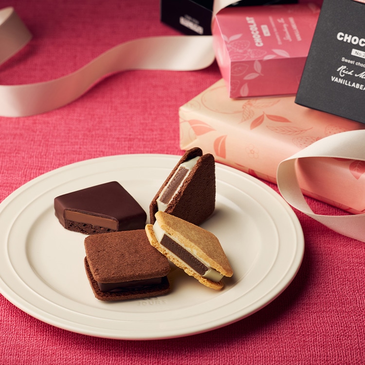 サクッ、パリッ、とろ~り。とろける生チョコレートをこだわりのクーベルチュールでコーティングし、サクサクのバタークッキーでサンドした、バニラビーンズオリジナルの生チョコクッキーサンド「ショーコラ」。一度口にしたら虜になる当店のロングセラー商品です。豊かなバターの風味とフェアトレードチョコレートを使用した"生チョコレート"の濃厚な甘さが口いっぱいに広がる味わいは、特別な日のお楽しみや、大切な人への贈り物としてもおすすめです。