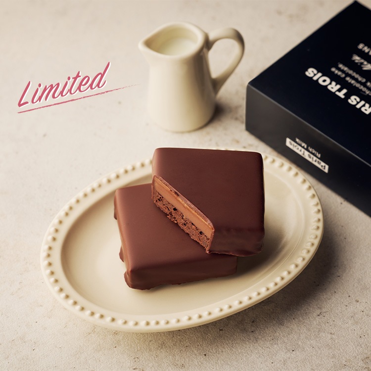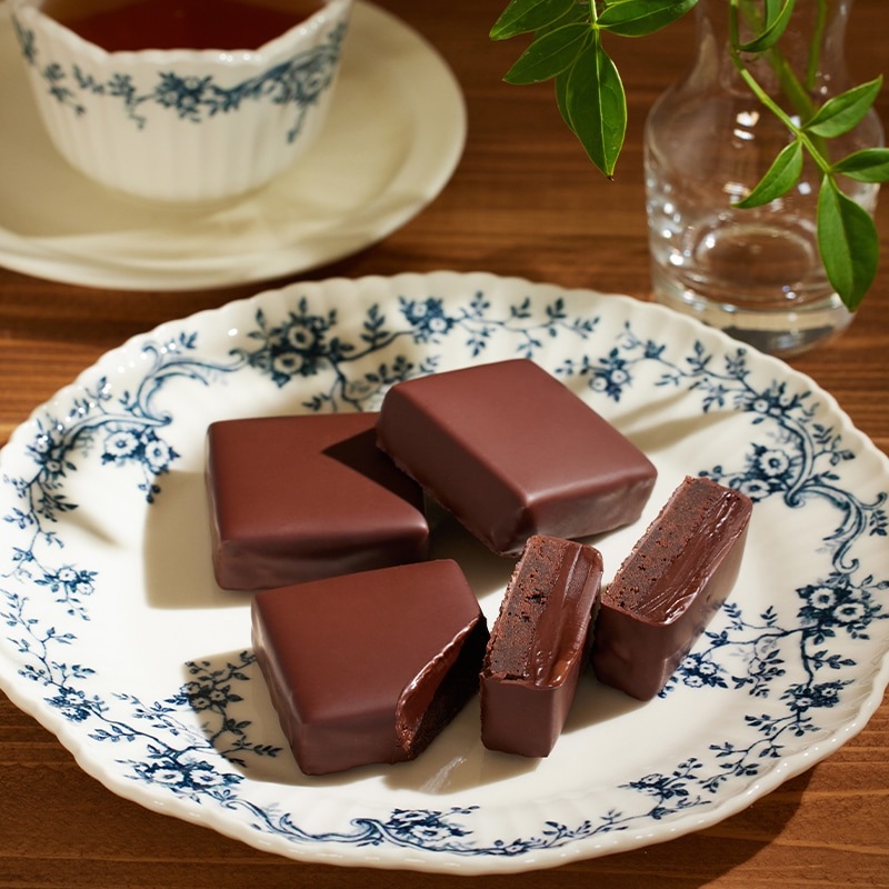 濃厚なカカオ香るしっとりとしたクラシックショコラととろける口どけの生チョコレートの2層を、パリっと食感のチョコレートでコーティングしました。コーティングチョコのパリッとした食感が美味しさを物語り、口に入れた瞬間にとろりと溶ける甘さ控えめのガナッシュ。さらに、濃厚さの要となるしっとりとしたクラシックショコラ。この3層が奏でる「パリッ、とろっ、しっとり」のハーモニーを召し上がれ。