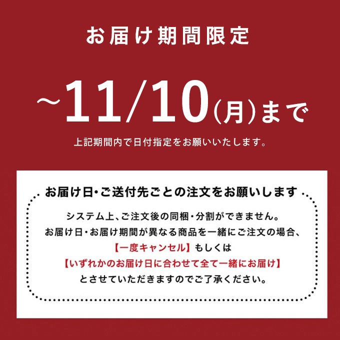 当店のシステム上、ご注文確定後にご注文を複数に分割したり、2つの注文を一つにすることができません。必ずお届け先、お届け日ごとのご注文をお願いします。誤ったご注文方法で購入された場合は、キャンセルとさせていただく場合がございます。