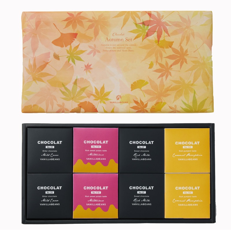 秋を感じるこっくりとした季節の味わいを存分に楽しめる「オータムセット」が登場しました。「蜜芋」の優しくほっくりとしたお芋の味と、「キャラメルパンプキン」のかぼちゃとキャラメル、そしてホワイトチョコレートの優しい甘さをぜひお楽しみください。定番の人気フレーバーも入ったセットは、秋らしい限定の包装紙をおかけしてお届けいたします。 秋の風味を感じる美味しいチョコレートと華やかな秋のパッケージは、季節のご挨拶や贈り物にぴったりです。