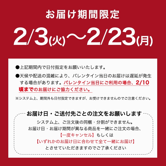 当店のシステム上、ご注文確定後にご注文を複数に分割したり、2つの注文を一つにすることができません。必ずお届け先、お届け日ごとのご注文をお願いします。誤ったご注文方法で購入された場合は、キャンセルとさせていただく場合がございます。