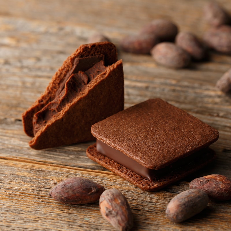 サクッ、パリッ、とろ~り。とろける生チョコレートをこだわりのクーベルチュールでコーティングし、サクサクのバタークッキーでサンドした、バニラビーンズオリジナルの生チョコクッキーサンド「ショーコラ」。一度口にしたら虜になる当店のロングセラー商品です。豊かなバターの風味とフェアトレードチョコレートを使用した"生チョコレート"の濃厚な甘さが口いっぱいに広がる味わいは、特別な日のお楽しみや、大切な人への贈り物としてもおすすめです。