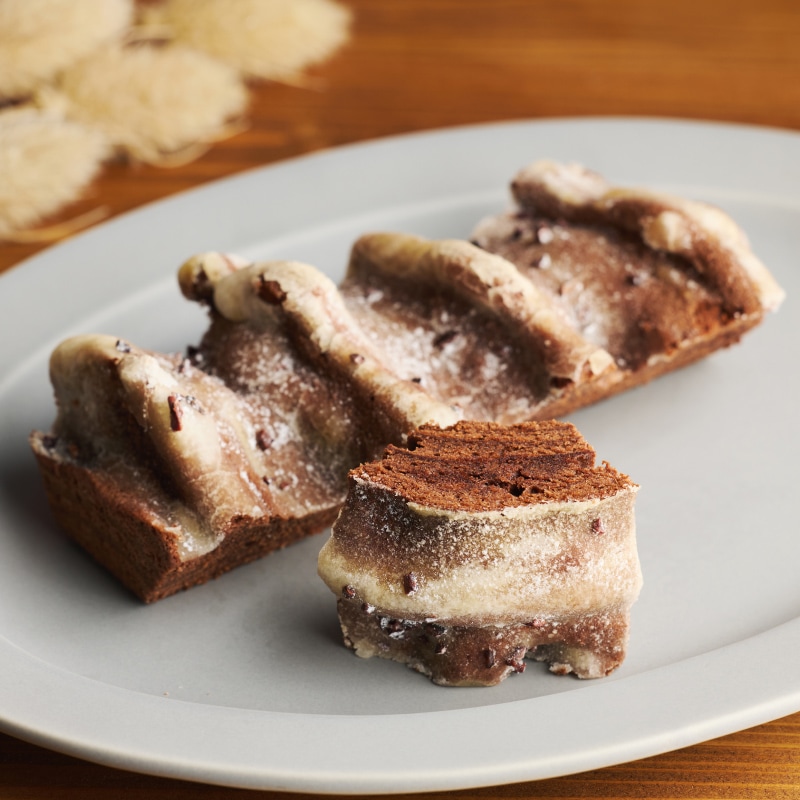 ガーナ産とエクアドル産のカカオを使用したチョコレートをブレンドし、生地に混ぜ込みじっくりと焼き上げたチョコレートバウムクーヘン。仕上げに自家焙煎したカカオニブをトッピングしました。