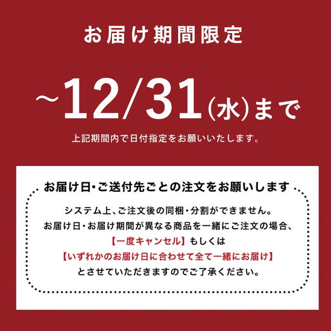 当店のシステム上、ご注文確定後にご注文を複数に分割したり、2つの注文を一つにすることができません。必ずお届け先、お届け日ごとのご注文をお願いします。誤ったご注文方法で購入された場合は、キャンセルとさせていただく場合がございます。