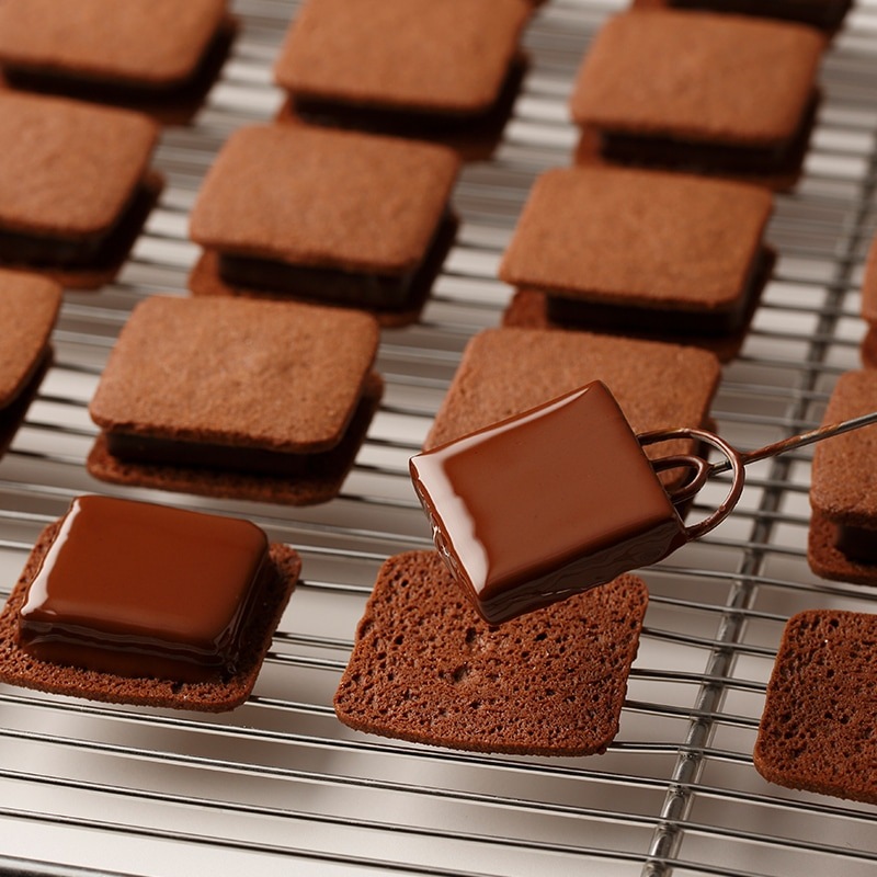 濃厚なカカオ香るしっとりとしたクラシックショコラととろける口どけの生チョコレートの2層を、パリっと食感のチョコレートでコーティングしました。コーティングチョコのパリッとした食感が美味しさを物語り、口に入れた瞬間にとろりと溶ける甘さ控えめのガナッシュ。さらに、濃厚さの要となるしっとりとしたクラシックショコラ。この3層が奏でる「パリッ、とろっ、しっとり」のハーモニーを召し上がれ。