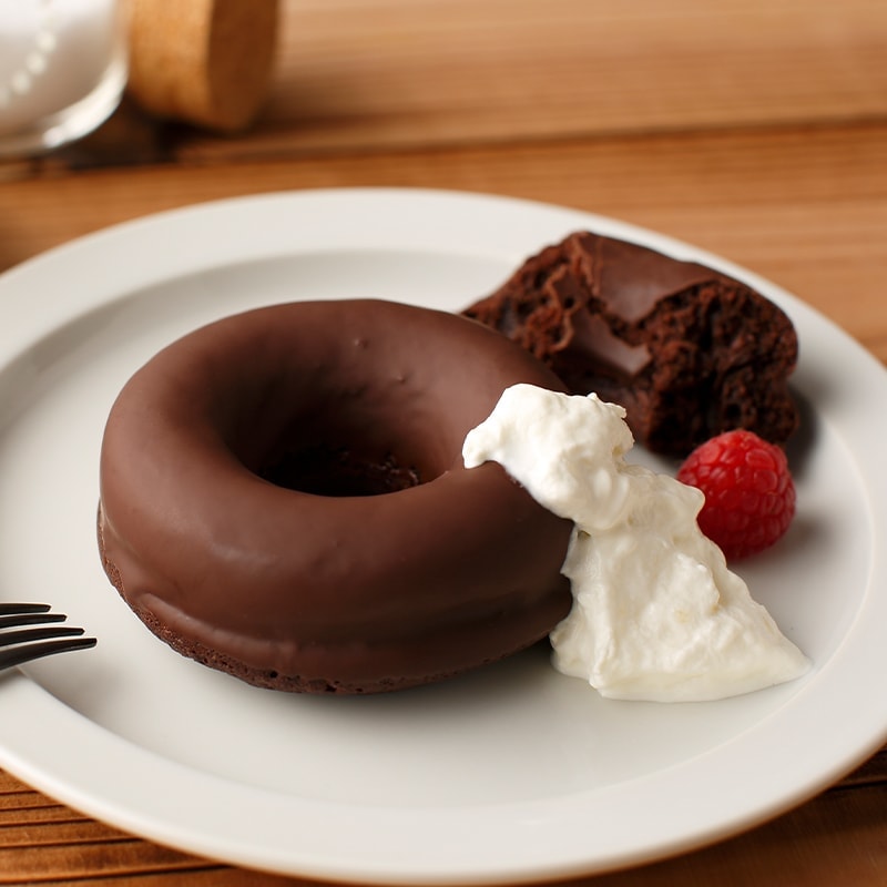 生地を数日間じっくりと寝かせ、揚げずに「焼く」ことで出来上がるしっとりとしたガトーショコラ生地。そして、ほろ苦く、ほろ甘いカカオ55%の上質なチョコレートをたっぷりとコーティング。丁寧に時間をかけて完成する、最高級の口どけをお楽しみください。