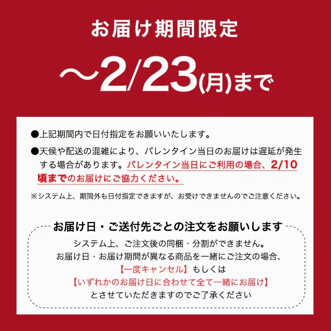当店のシステム上、ご注文確定後にご注文を複数に分割したり、2つの注文を一つにすることができません。必ずお届け先、お届け日ごとのご注文をお願いします。誤ったご注文方法で購入された場合は、キャンセルとさせていただく場合がございます。
